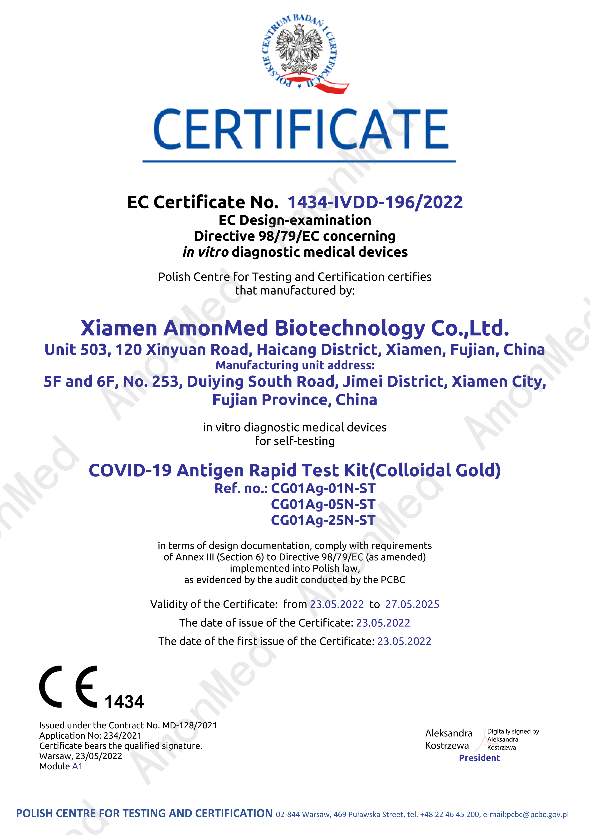 2022年5月23日,廈門奧德生物自主研發(fā)的,用于個人和家庭自測的,前鼻拭子新型冠狀病毒抗原快速檢測試劑盒 (膠體金法),正式獲得歐盟公告機構(gòu)PCBC認(rèn)證的CE證書。此次CE認(rèn)證,意味著廈門奧德生物家用自測版前鼻拭子新冠抗原測試試劑盒可在歐盟27個成員國及其他認(rèn)可歐盟CE認(rèn)證的國家上市銷售。